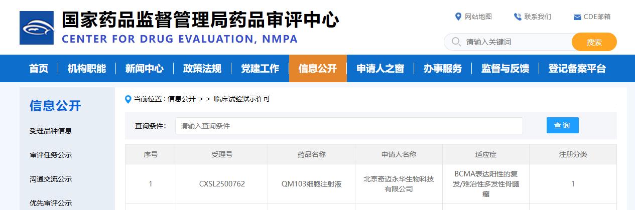 2025年12月2日,北京奇迈永华生物科技有限公司(以下简称“奇迈永华”)自主研发的“QM103细胞注射液”获得国家药品监督管理局(NMPA)临床试验默示许可(受理号:CXSL2500762)。这是国内首款获批临床的靶向BCMA的CAR-NK细胞治疗产品,适应症为复发/难治性多发性骨髓瘤(RRMM),博腾生物对此表示热烈祝贺!